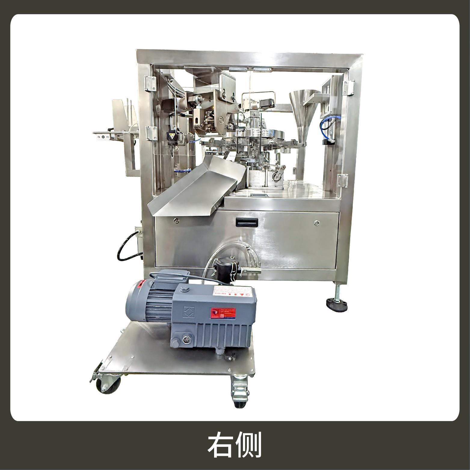 The machine adopts an intermittent rotating platform with multiple stations (bag feeding, bag opening, filling, sealing, etc.) distributed circularly. Continuous process connection is realized by rotation, with compact structure, space saving, and high efficiency for high-volume packaging requirements.